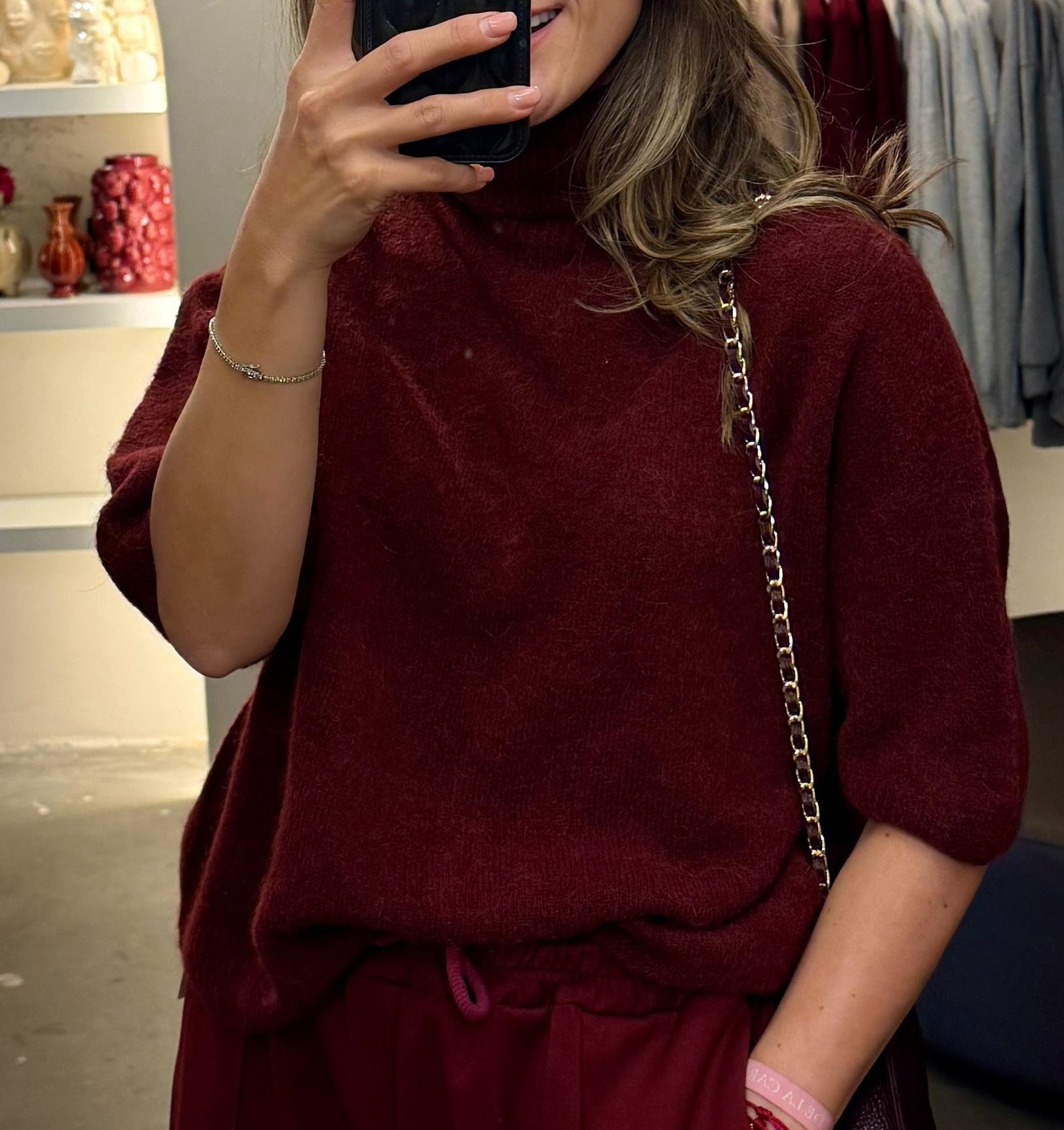 De Livia Alpaca Knit in diep bordeauxrood is een coltrui met 3/4 mouwen en 30% alpacamix die zacht, warm en luxueus aanvoelt, terwijl het polyamide zorgt voor een lichte stretch en toch zijn vorm behoudt.