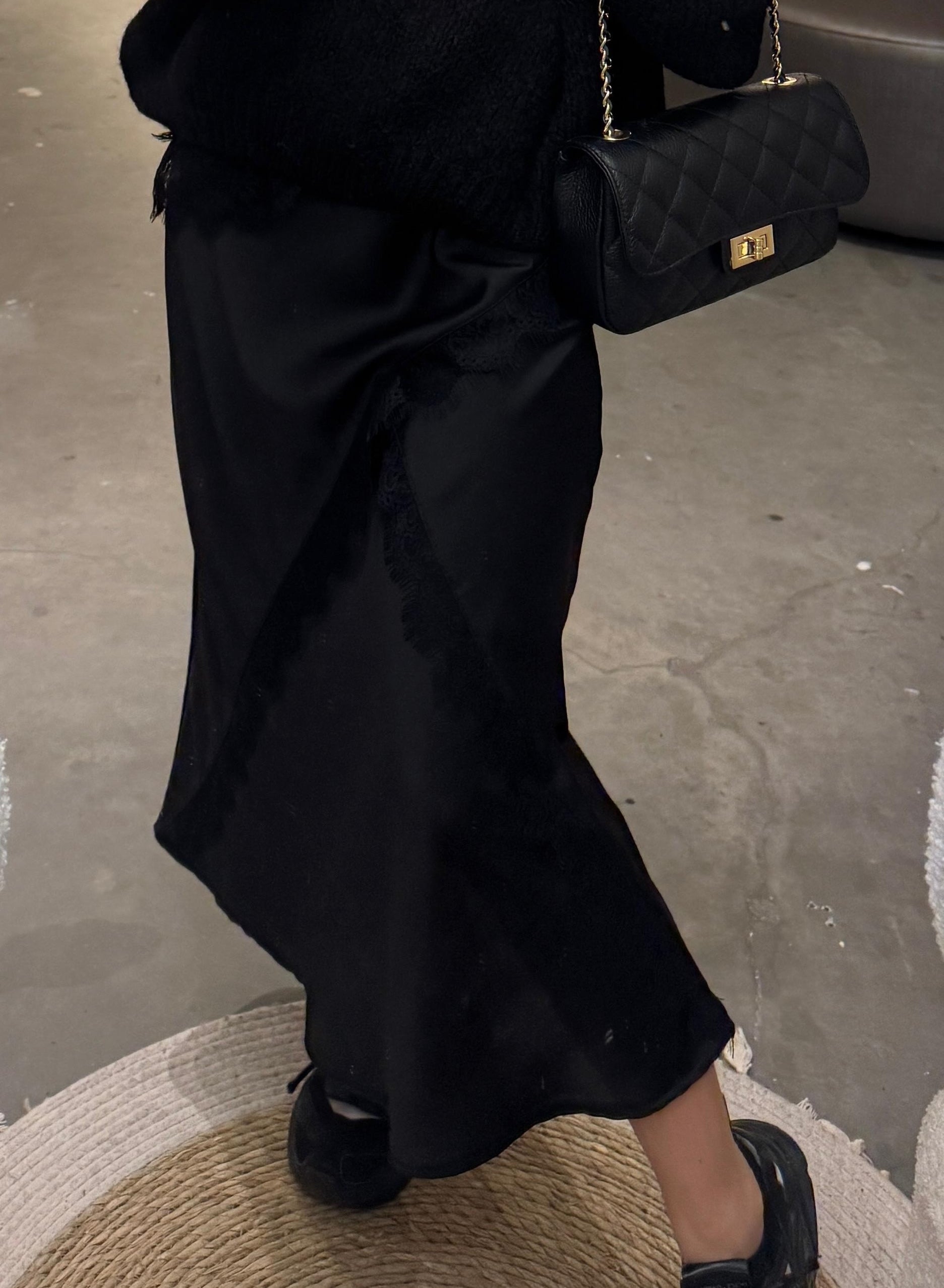 De Belle Satin Lace Rok in zwart is een elegante satijnen A-lijn midi-rok met verfijnde kanten details.