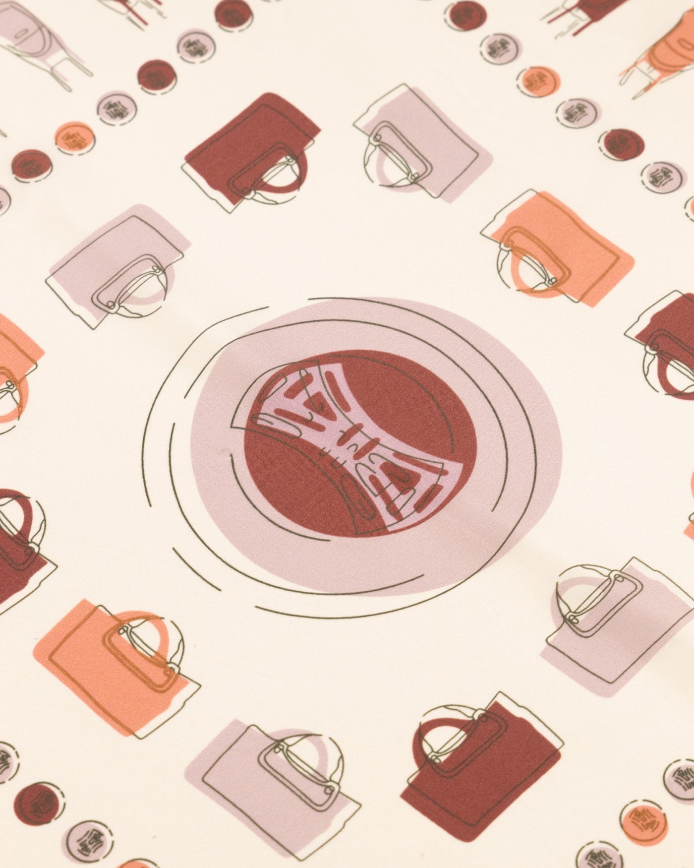 Het ontwerp combineert speelse handtassen in roze, bordeaux en beige met accenten geïnspireerd op vintage-tasmotieven