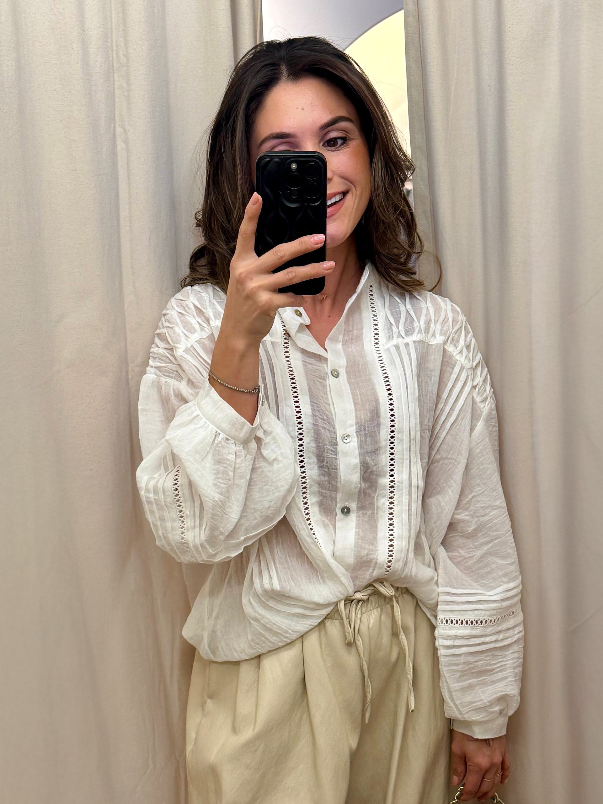 De Celia Blouse is een luchtige damesblouse in een zachte crèmekleurige tint, gemaakt van fijn geweven katoenen mousseline die ademend en licht aanvoelt.