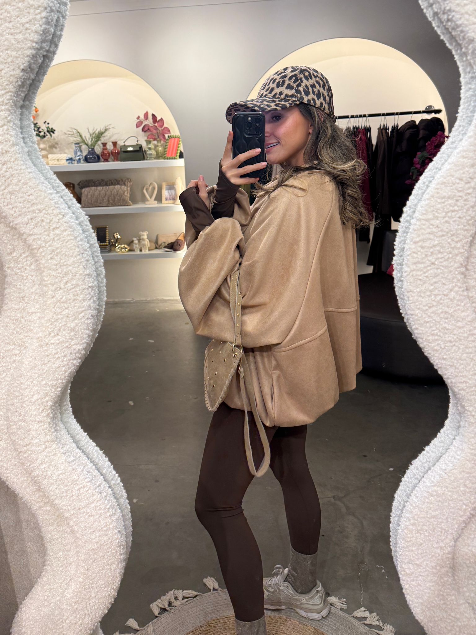 De Flavia Jas in camel bruin is een oversized statement jas gemaakt van zacht suèdelook materiaal met een luxe, fluweelachtige touch.