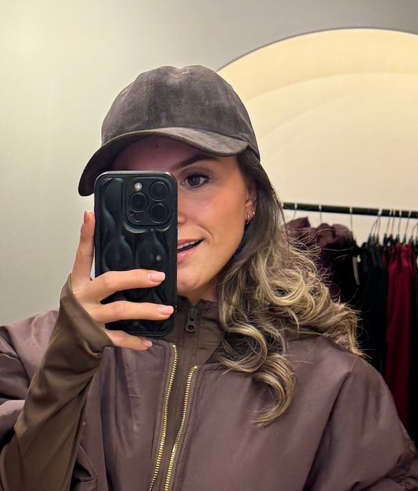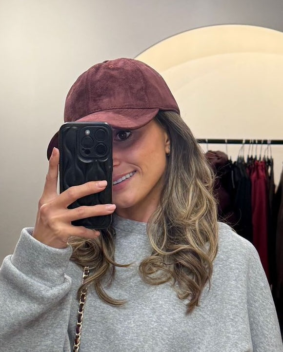 Deze sportieve pet van luxe suède heeft een natuurlijke wassing in grijs of roze, waardoor hij direct een vintage uitstraling heeft en een zachte fluweelachtige textuur.