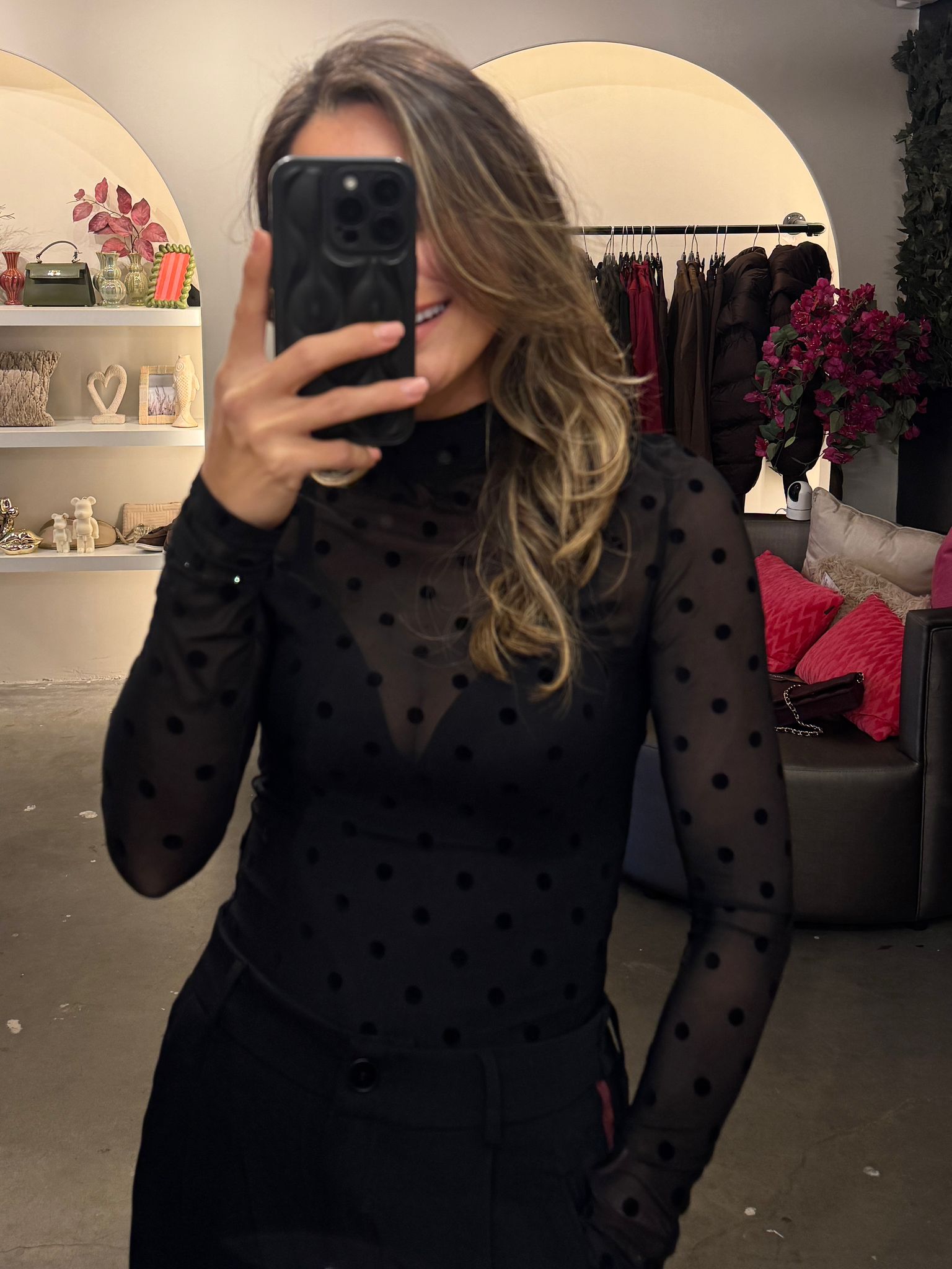 De Maje Top in zwart is ee semi-transparante mesh met een stippendessin.