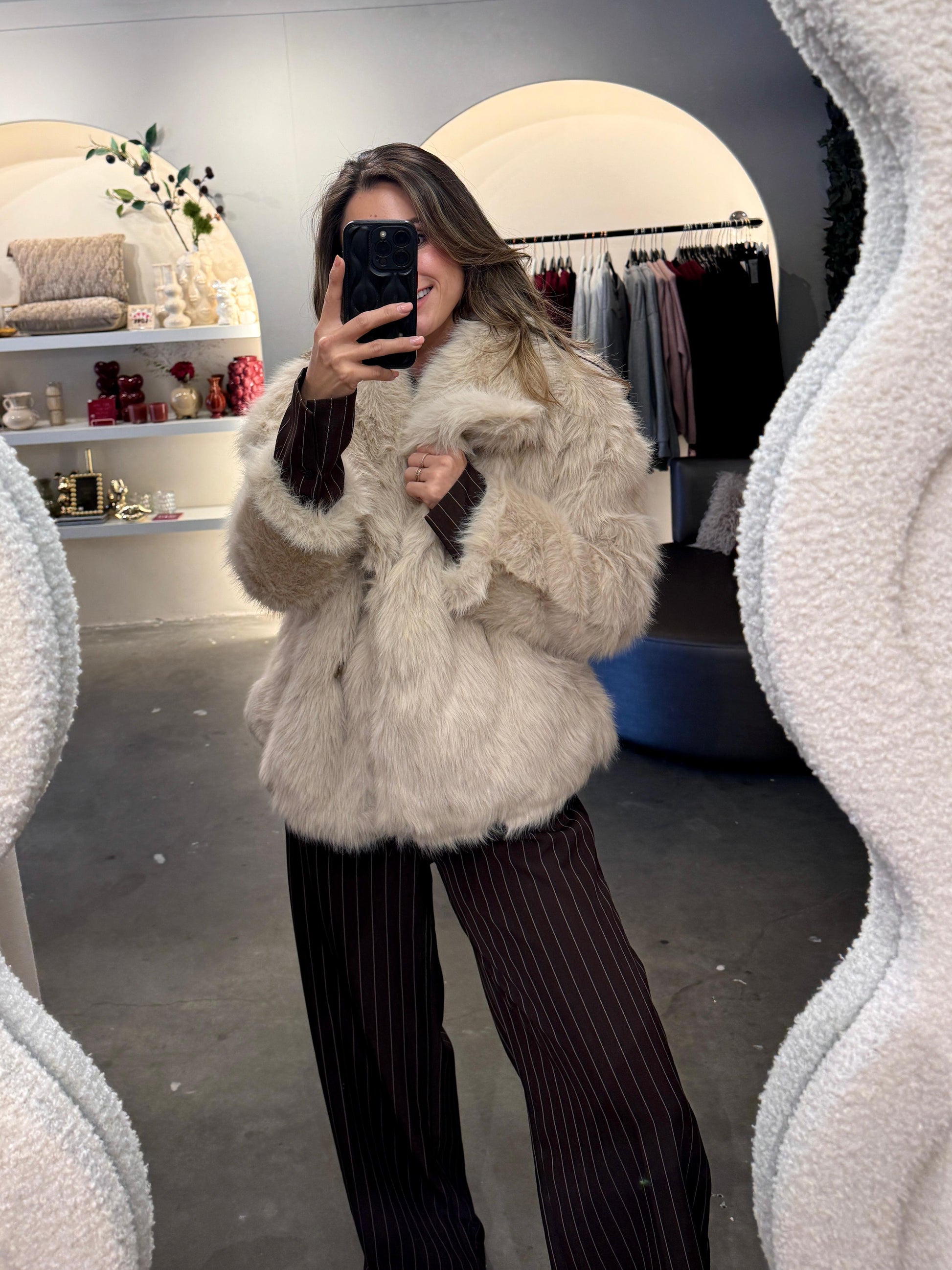 De Marisse jas is een luxe imitatie bontjas met drukknopen in een crèmekleur die warm aanvoelt en een natuurlijke glans heeft die moeiteloze elegantie uitstraalt.