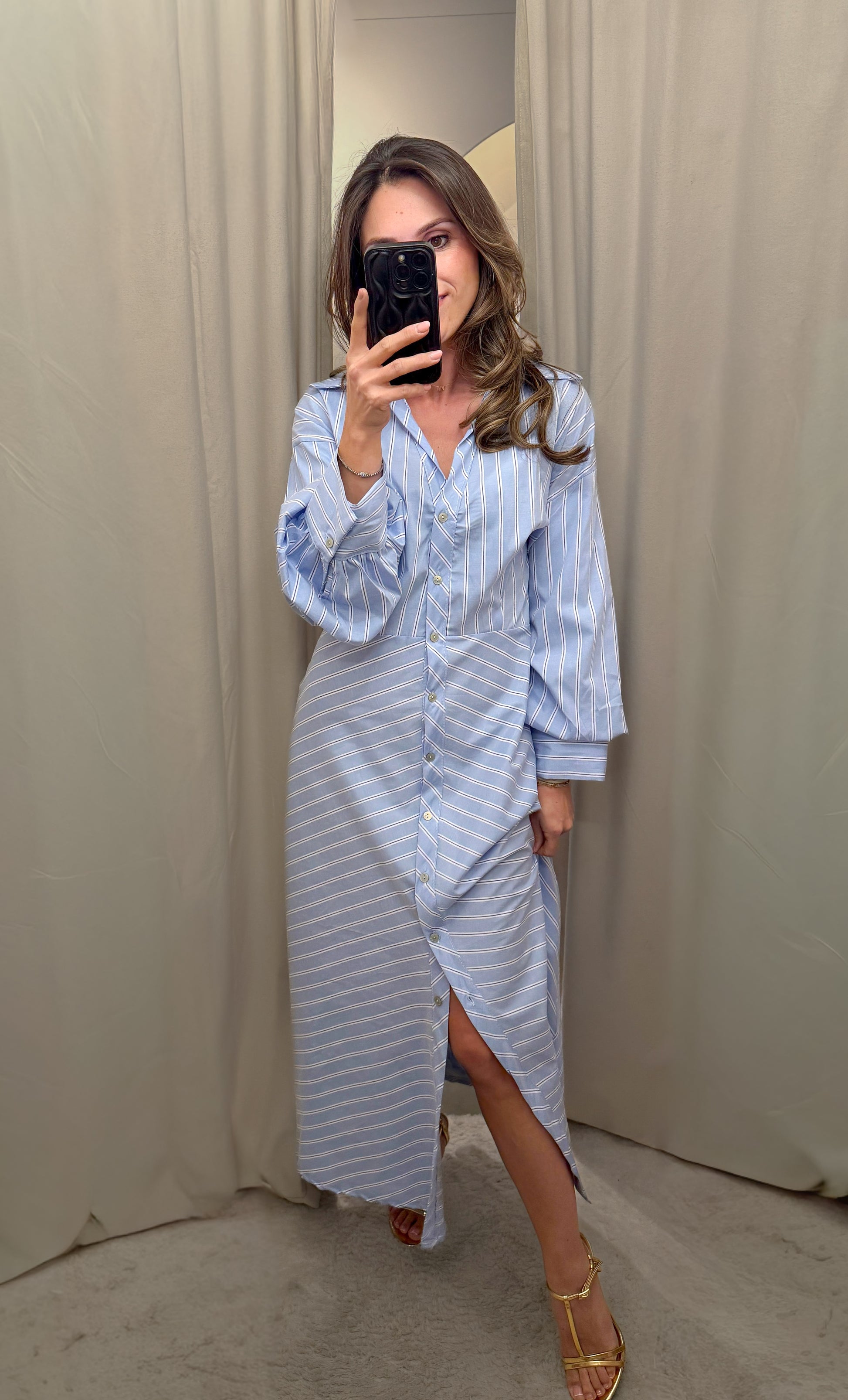De doorlopende knoopsluiting maakt de jurk veelzijdig in styling: draag hem als jurk, open als lange blouse of losjes voor een gelaagde look. De lange mouwen met manchetten en knoopdetails zorgen voor een verfijnde afwerking.