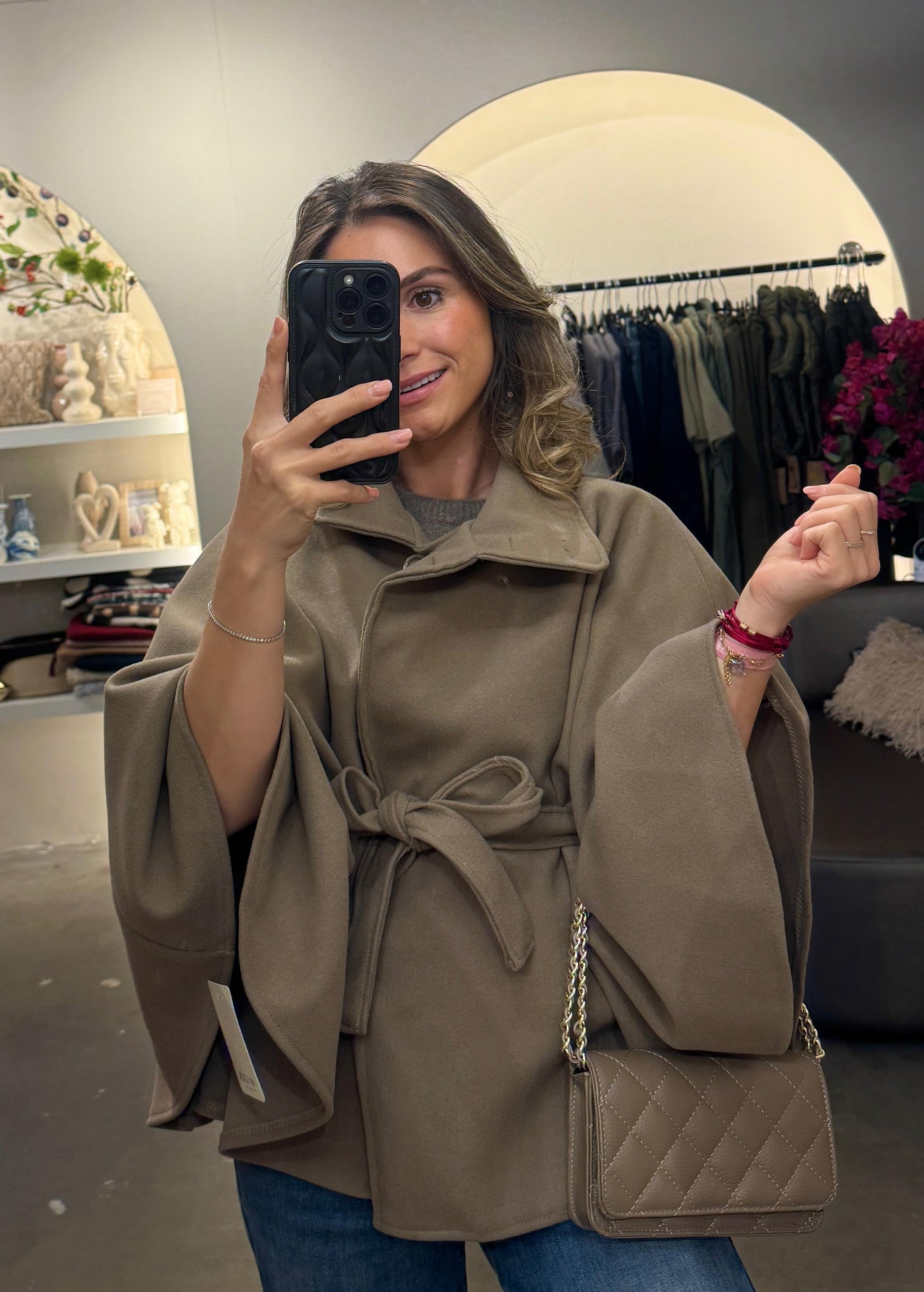 Het zachte, suèdelook materiaal voelt comfortabel en warm aan, terwijl de hoge kraag en brede mouwen zorgen voor een verfijnd, modern silhouet. De ceintuur accentueert subtiel de taille en geeft de jas een moeiteloos chique uitstraling.