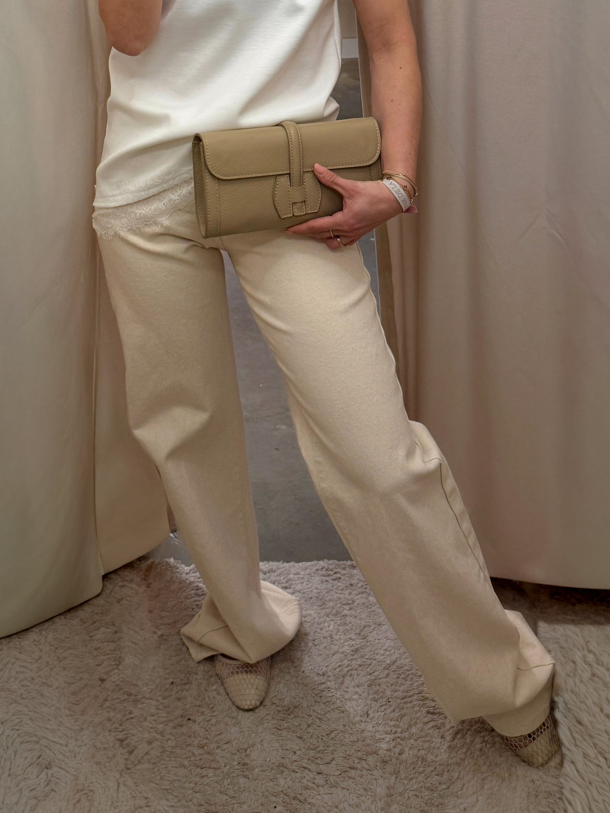 De Nora Wide Leg Jeans is een jeans met hoge taille in een zachte beige crèmekleur en een moderne, wijde pijp.
