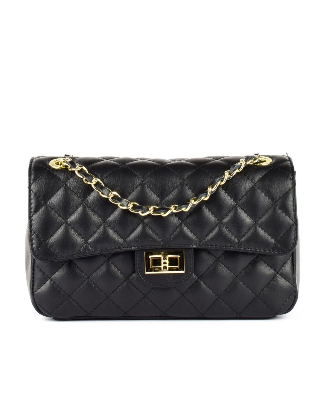 De goudkleurige draaisluiting en lange chain strap maken haar ideaal als shoulder bag en crossbody. De zwarte leer finish geeft die tijdloze, stille luxe uitstraling die werkt met casual denim én met chique avond outfits.