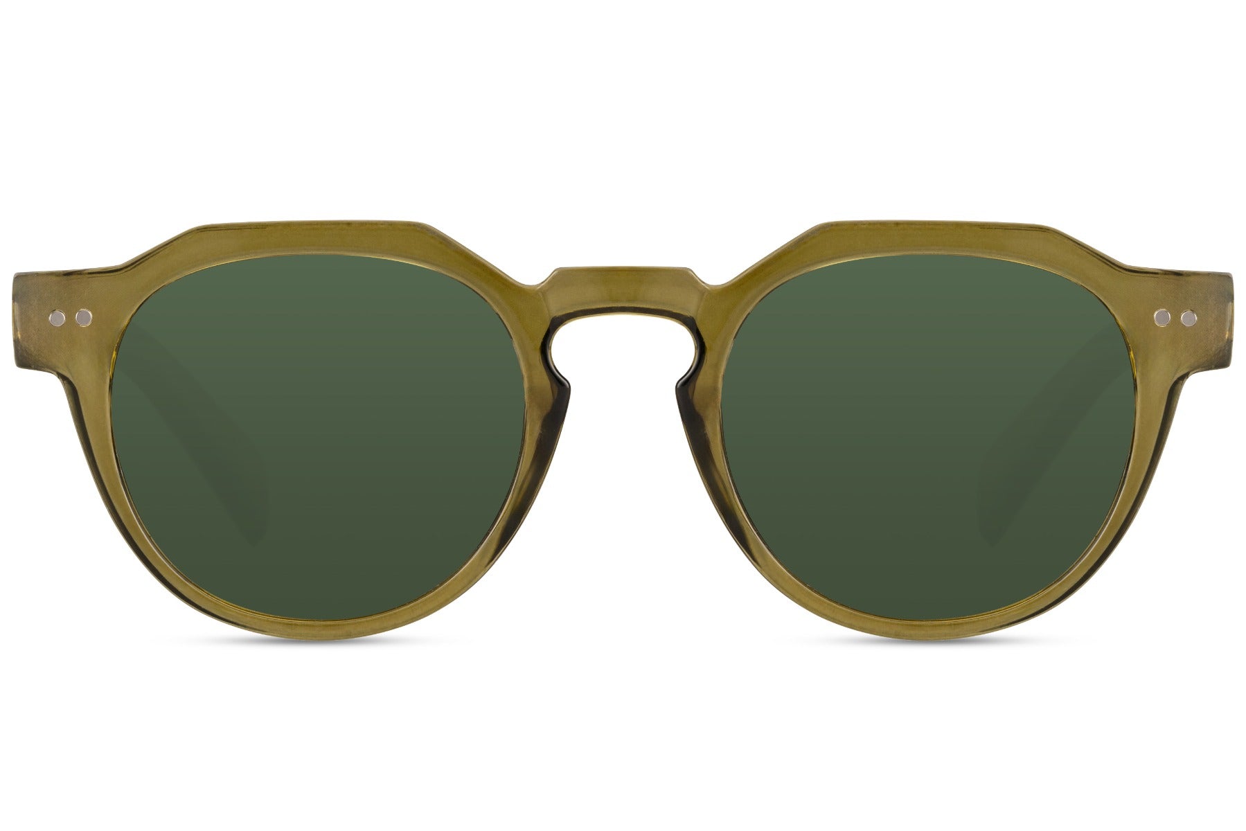 Deze transparant olive green ronde zonnebril en de diepe groene lenzen geven elke outfit een instant frisse upgrade.