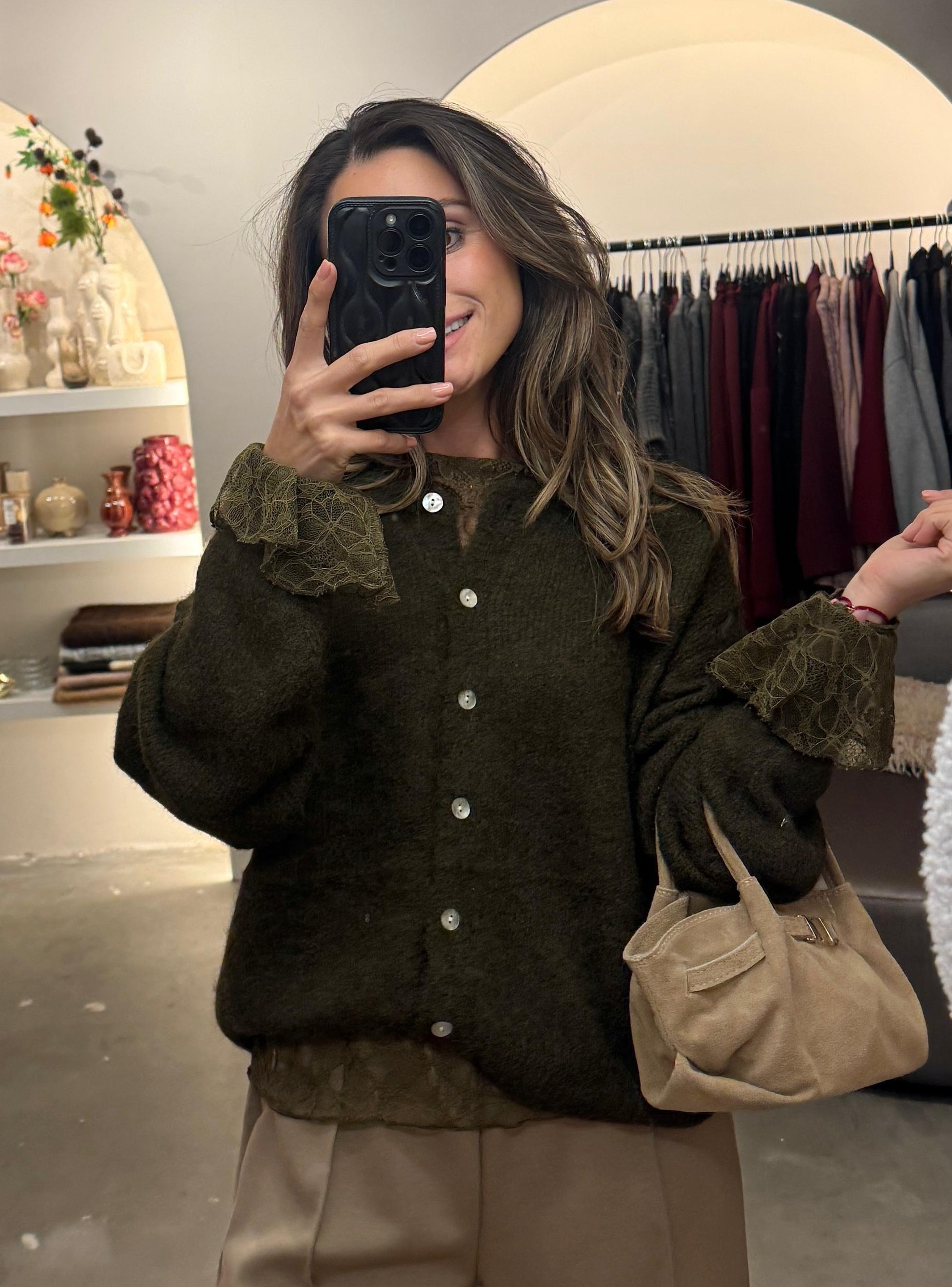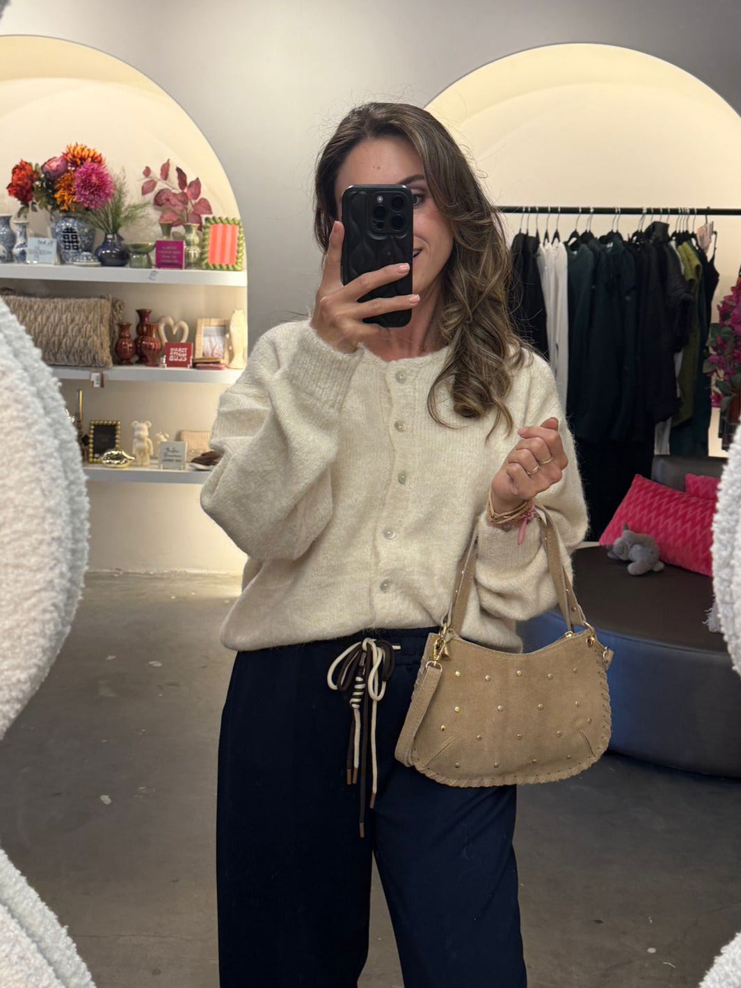 De cardigan heeft een korte pasvorm en een subtiele knoopsluiting aan de voorkant. Je draagt hem als vestje over een top, of als een elegante trui.