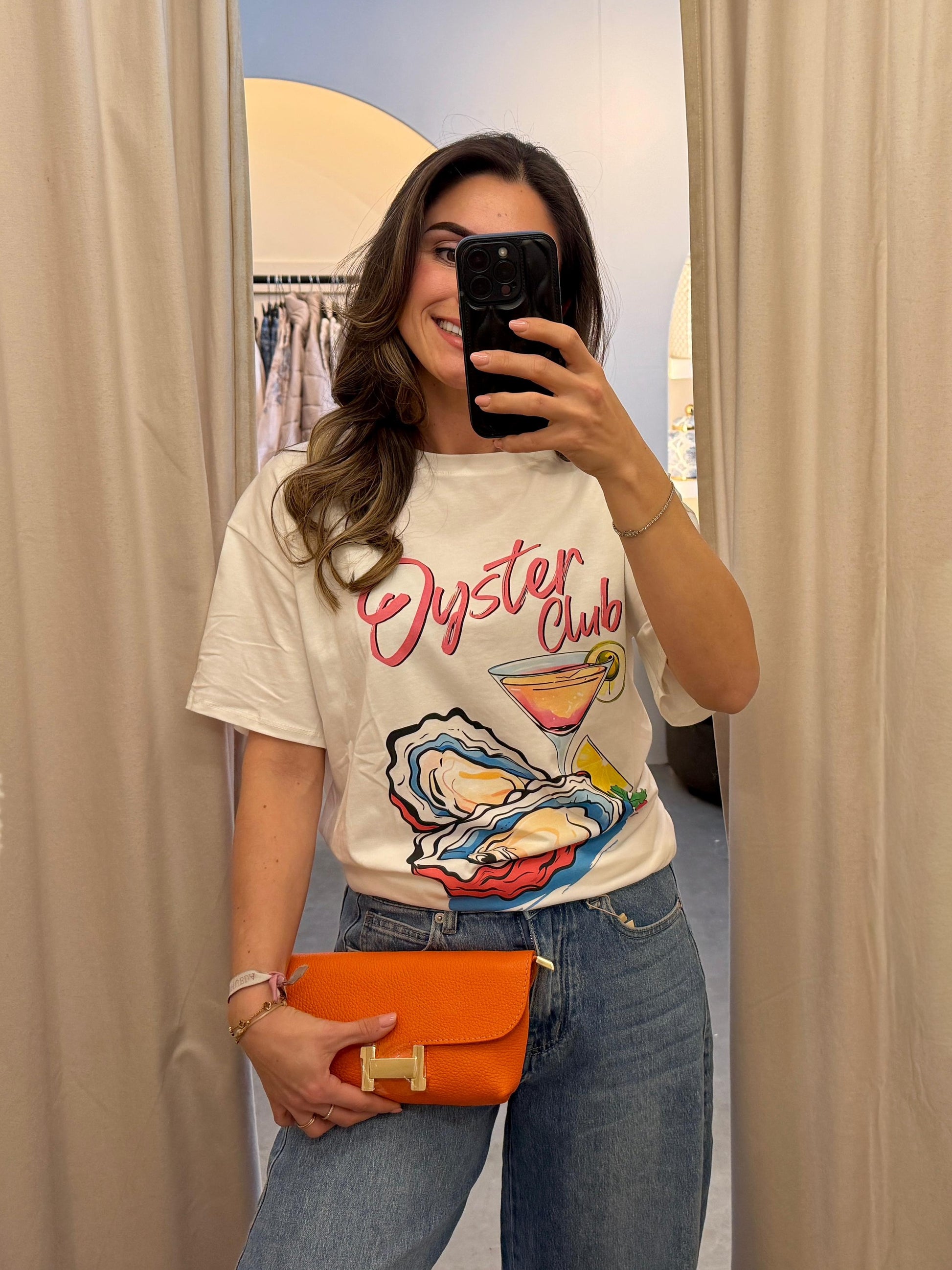 Het Vintage Club Tee is een wit T-shirt met de tekst ‘Oyster Club’ op de voorkant.